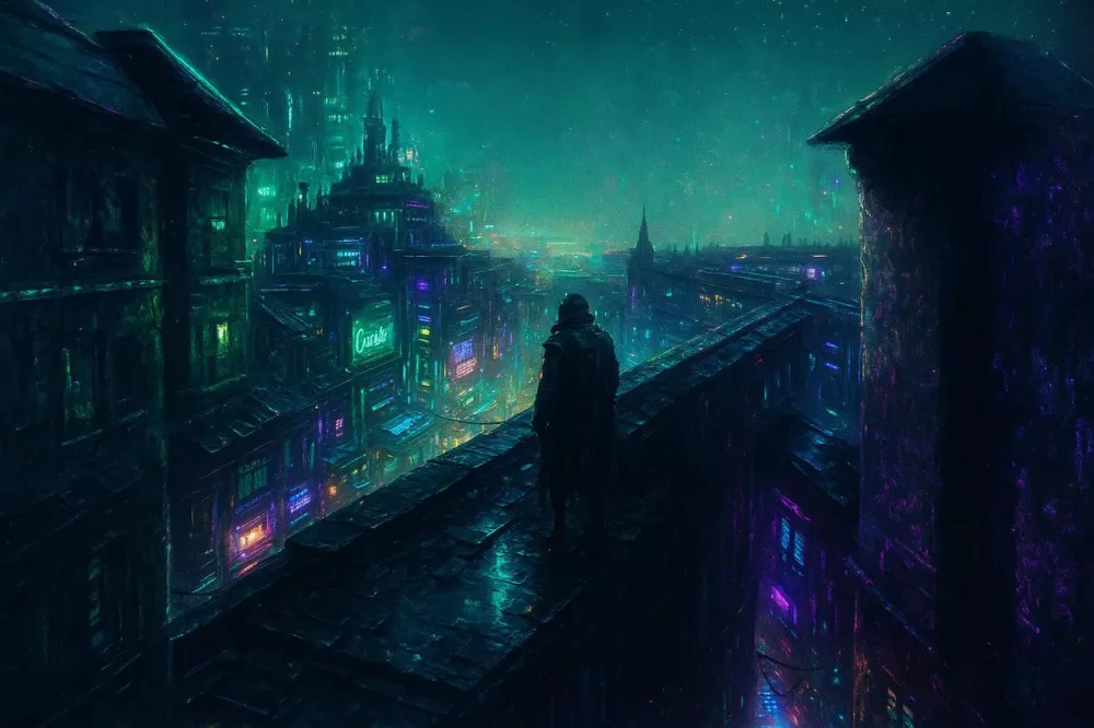 霓虹迷雾弥漫,绿蓝紫光交织的高楼林立,中心人物身披斗篷、站在高台之上,背对镜头,只能说,和19世纪的法国乡村风景风马牛不相及。