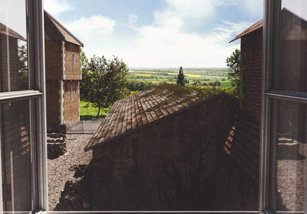 实际上,当中那块三角形亮斑,并不是建筑结构,而是庭院地面在长时间曝光下,被阳光照射后留下的亮斑。图像左右是庄园的建筑墙面,远处依稀可见的则是一棵树和农田的地平线。