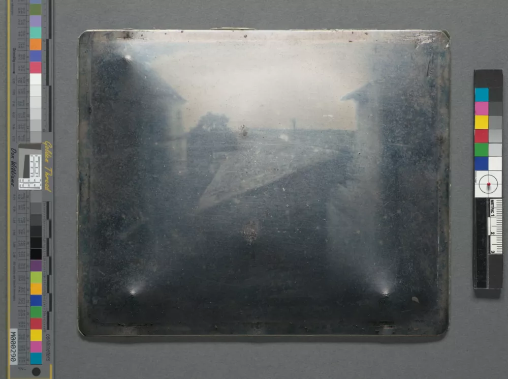 照片的作者尼埃普斯站在自家二楼的工作室窗边,架好镜头,对准庭院和远处景色,连续曝光几天,才在一块抛光锡板上捕捉到这段模糊而珍贵的影像。