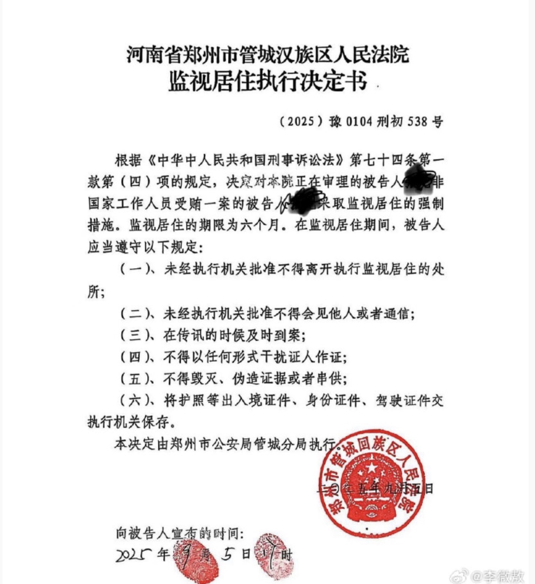 据网传图片显示,该文件为一份2025年9月5日签发的“监视居住执行决定书”,签发机构为“河南省郑州市管城汉族区人民法院”,但在文件下面,红色印章显示“郑州市管城回族区人民法院”。