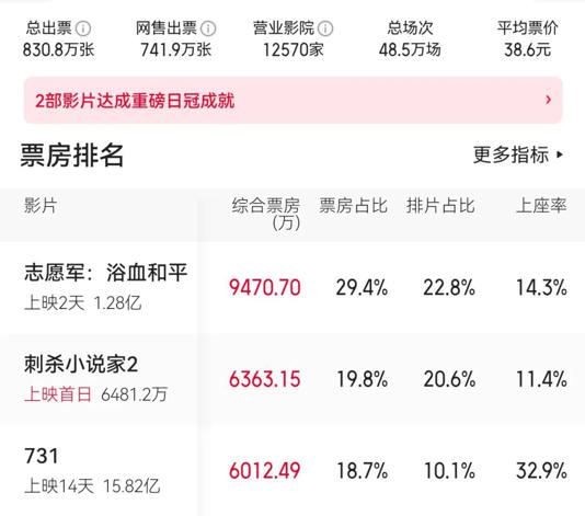 国庆第一天,《731》也没想到吧,以仅10.1%的排片砍下了18.7%,上座率直接断层第一,票房预测直接给大幅上调至20亿,远超预期!