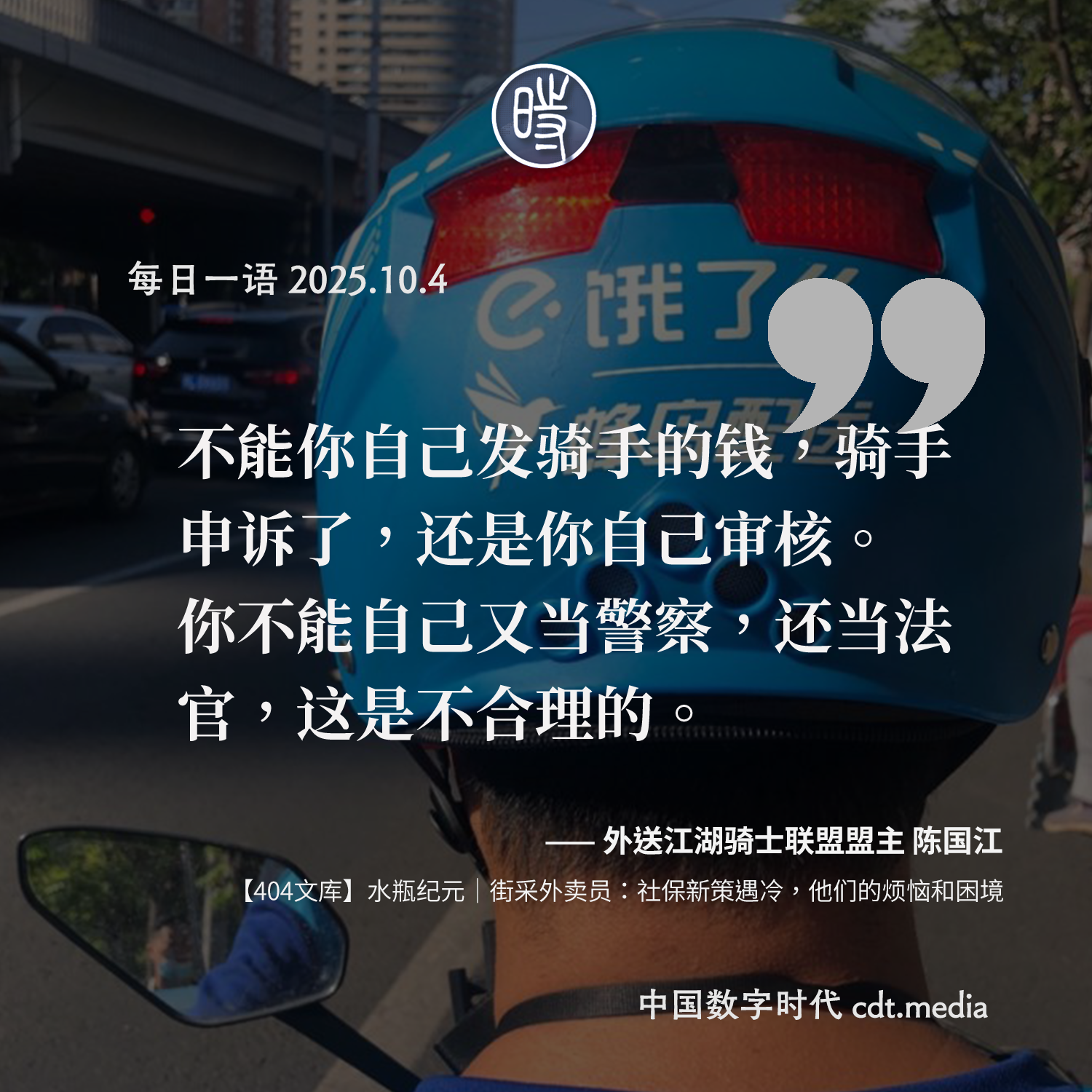 陈国江认为,绝大部分外卖员的核心诉求不是社保,而是单价不能一降再降。此外,骑手和平台缺乏对等的谈判地位。https://chinadigitaltimes.net/chinese/721328.html