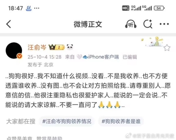 天娱传媒编剧汪俞岑在微博发文披露“狗狗去向”。(截图)