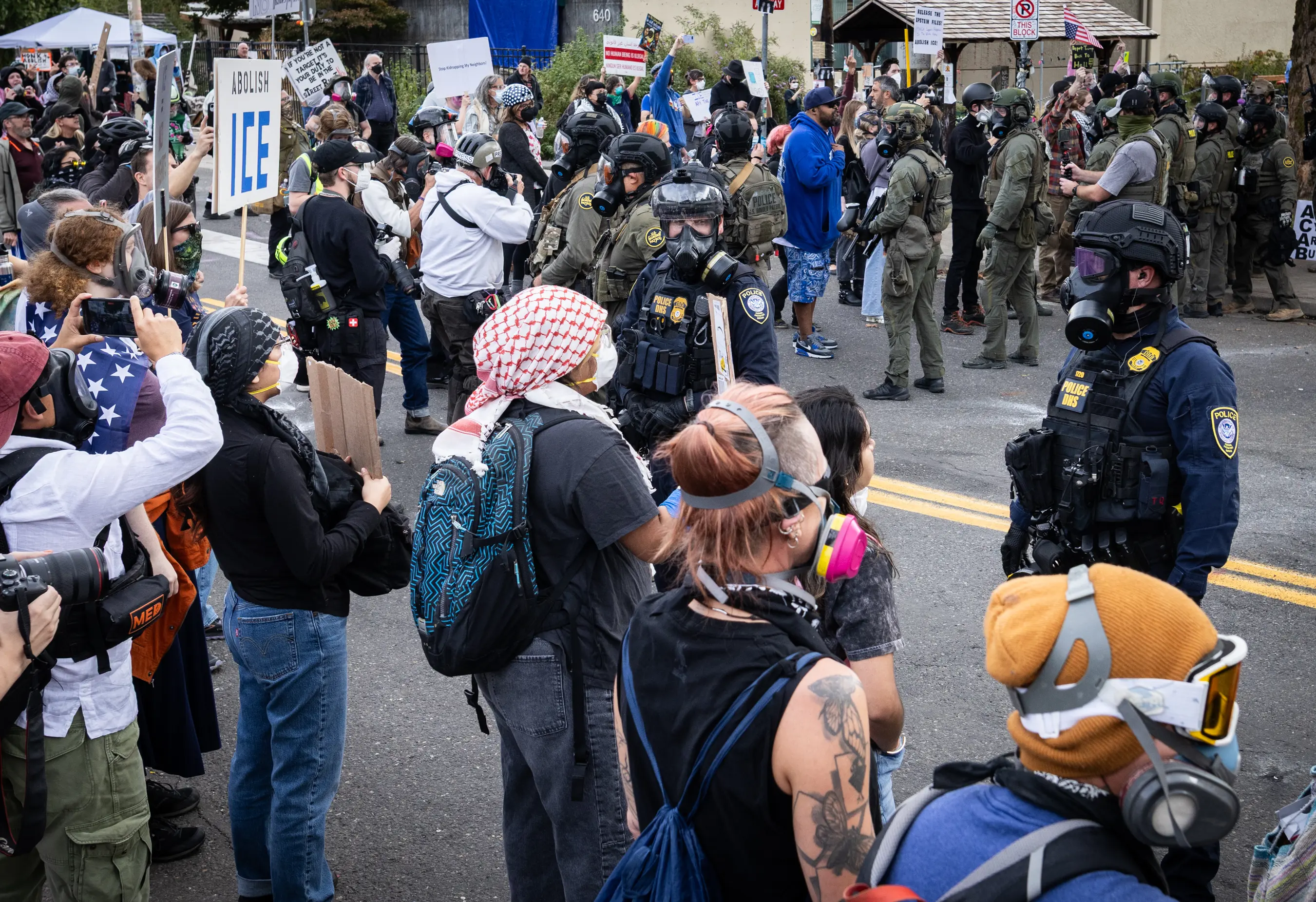 2025年10月4日,抗议者聚集于俄勒冈州波特兰市移民及海关执法局(ICE)办公室前。(John Fredicks/..;