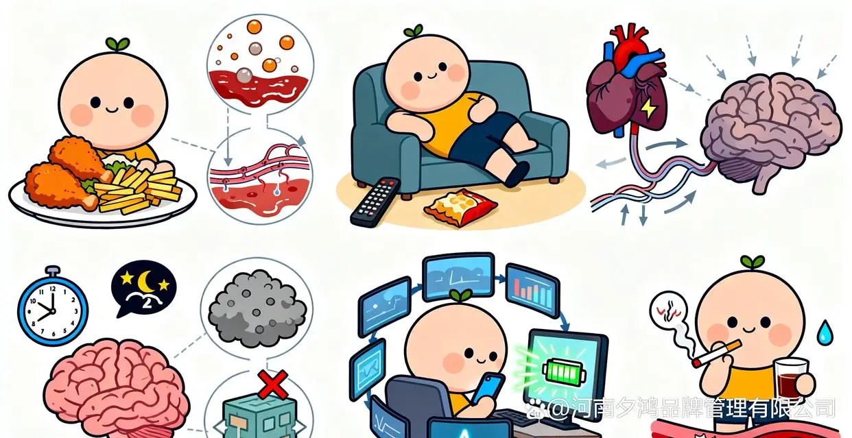 长期高脂饮食导致血液粘稠度增加,影响脑部微循环功能。缺乏体育锻炼使心肺功能下降,输送到脑部的氧气和营养减少。睡眠不足或质量差影响脑部代谢废物清除,损害记忆功能。过度使用电子设备导致用脑过度,加重脑部能量消耗。吸烟饮酒等不良习惯直接损伤血管内皮,影响脑部血液供应。