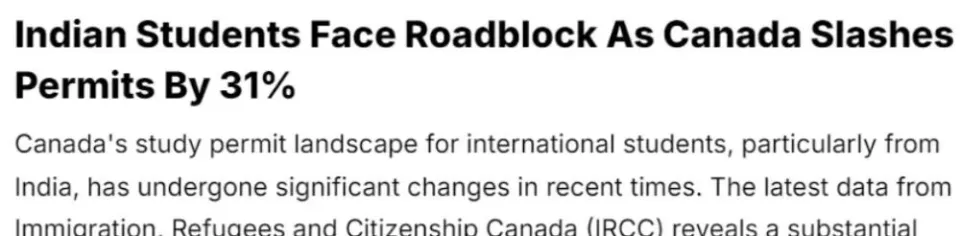 2024年大约有42.7万印度人在加拿大学习,但是在2025年第一季度,加拿大只向印度学生发放30,640份学签,和2024年同期的44,295份相比下降近31%。