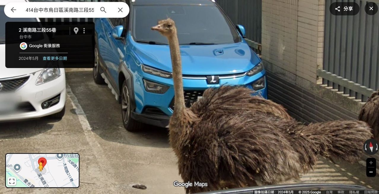 最近有网友意外发现去年台中乌日有围捕鸵鸟场面,鸵鸟还一脸不爽,影片一出,引起网友热议。(图/截自Google Maps)