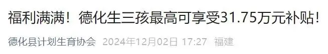 2024年12月,福建一地官宣“天价”补贴——生三孩最高补贴31.75万元!
