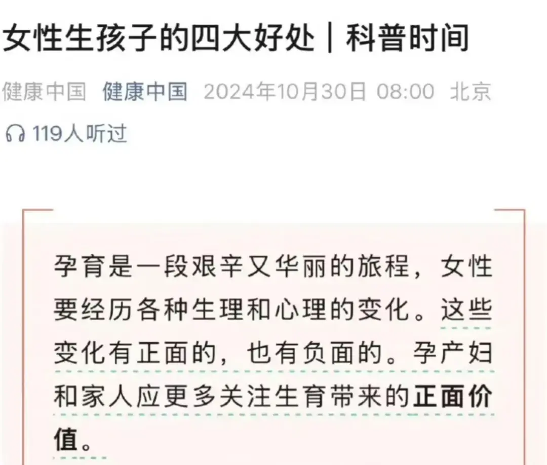 “网红”城市长沙,惊险“嫁校”,贴出“生三胎最牛”“辅导作业最牛”“我愿意带崽”等标语,“健康中国”发布“科普”文章,传播《女性生孩子的四大好处》:
