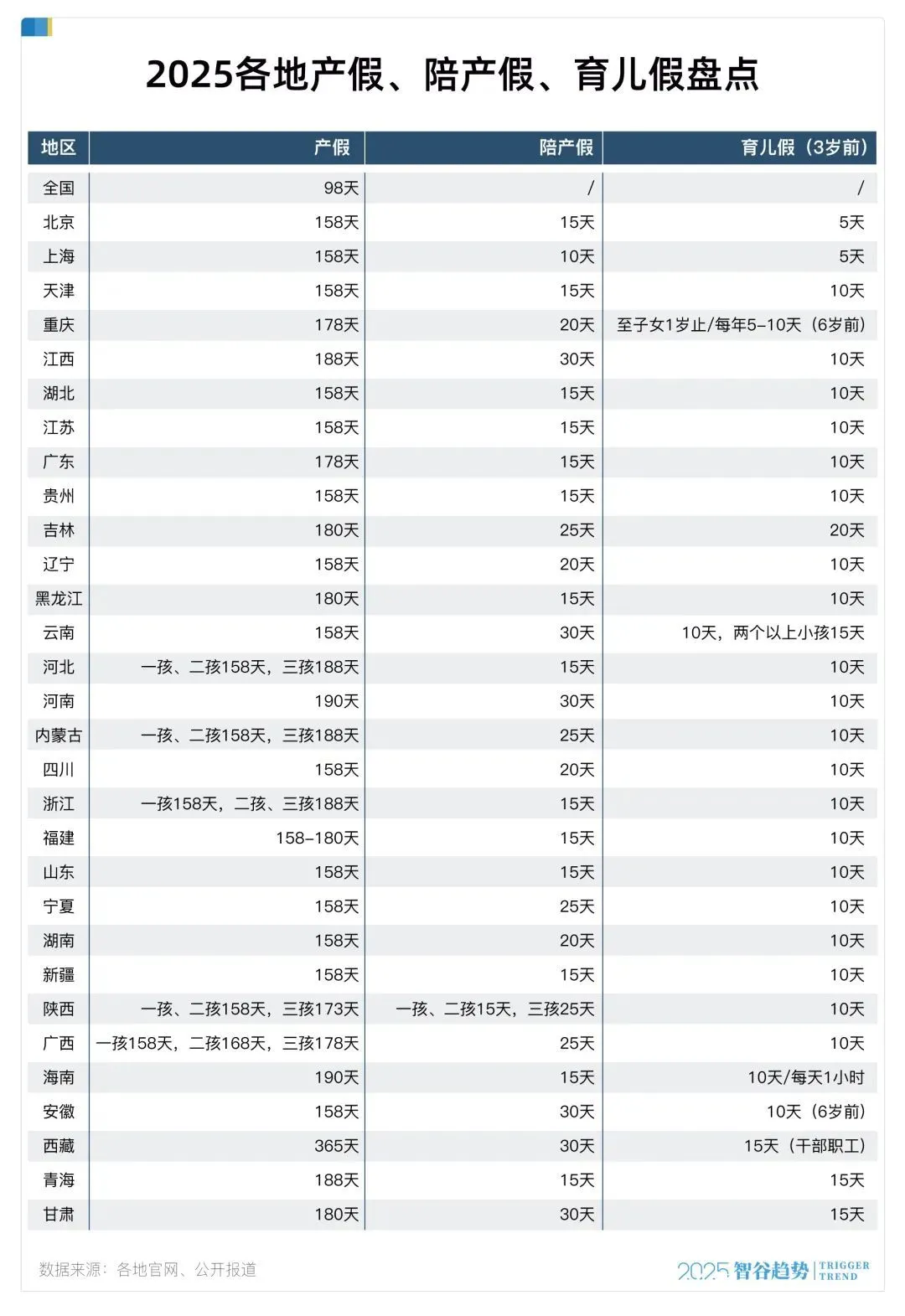 还有从南到北,从东到西掀起的产假延长潮,“全面二孩”实施之前,全国各地大多只有98天的产假,但是这几年,均水涨船高,起步线已经来到158天,比过去多了2个月。
