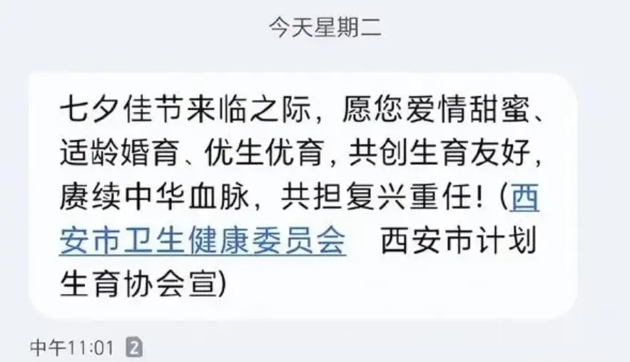 最令人破防的,可能还是历史名城陕西西安,在传统情人佳节七夕之夜,市卫健委和计生协会发出短信祝福: