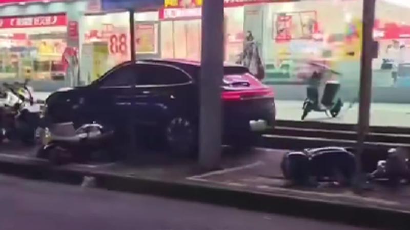 网传视频显示,一辆黑色轿车在街边非机动车道缓慢行驶,接连撞倒左侧多辆电动单车,然后又“游荡”到右侧,撞到路边的车棚。最后,车子疑似被东西挡住,才停了下来。