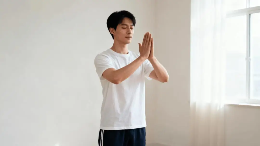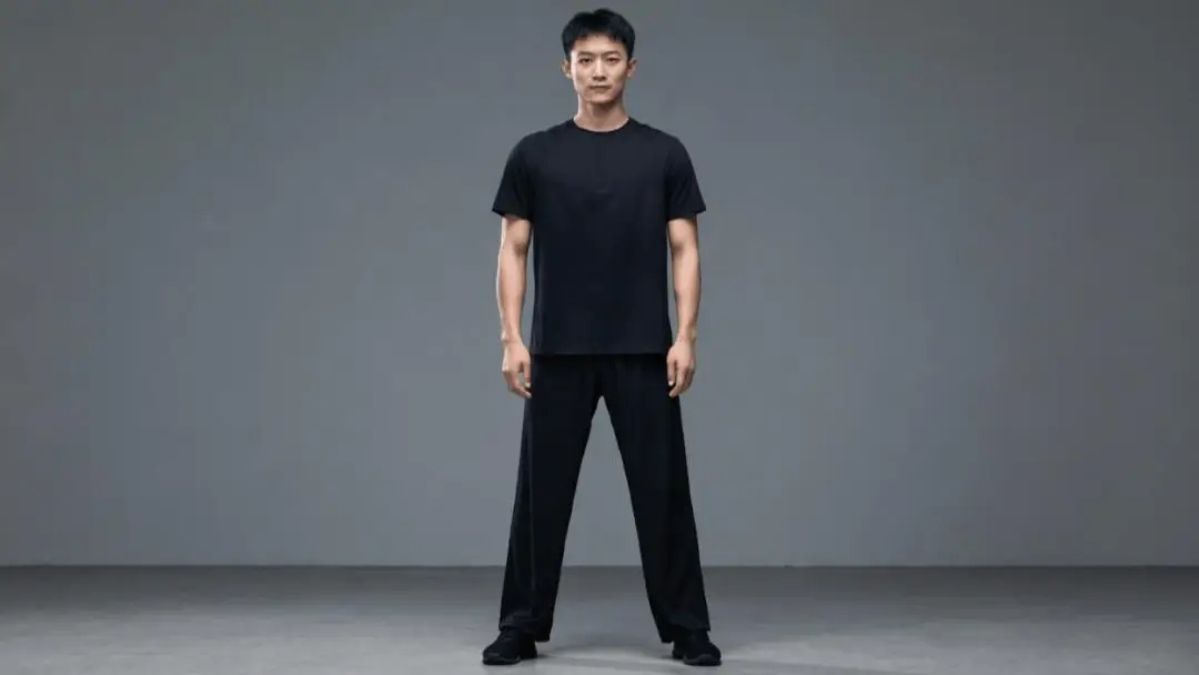 双脚自然分开,与肩同宽,身体站直,双臂放松下垂。双眼可微闭,调整呼吸,让心情平静下来。