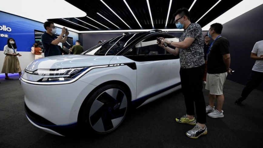 图为2022年7月20日,显示的是百度下一代自动驾驶汽车 Apollo RT6在北京亮相时,记者们正在观看。(NOEL CELIS/AFP via Getty Images)
