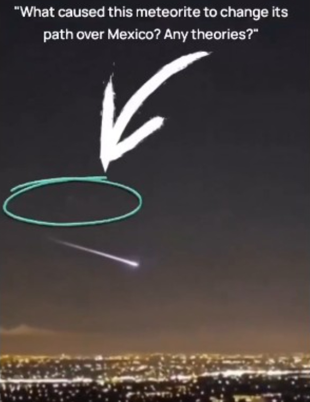 【奇迹出现:地外文明在保护人类】奇迹再次发生,就在一颗高速流星陨石即将击中墨西哥灯火通明城市时,一艘UFO飞船出现,隔空施加外力,弯曲改变了流星陨石在大气中的滑行路径,地球明显受到地外高级文明的监管。早在2013年,一架无人UFO在俄罗斯城市上空击穿一颗高速流星陨石,引导其高空爆炸。
