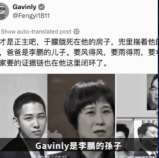 【于朦胧坠楼案三大家族血统“赵家人”涉入】于朦胧坠楼案持续引发关注,近日网上流传的内幕消息更添惊悚色彩。有知情人声称,事件的主导者背景极其深厚,官方刻意淡化其存在,因为他拥有三大家族血统,是真正的“赵家人”。根据网传消息,该名主导者名为李明(极光光),是于朦胧最终坠楼地点——阳光上东小区18号楼601室的主人。境外社交媒体(X平台)上,有用户于10月3日发帖爆料,声称“极光光”的真实身份令人震惊:他是李鹏的孙子、叶挺的重外孙、古木的重孙,集多重身份于一身的“纯正赵家人”。爆料人感叹:“这才是正主吧!于朦胧死在他的房子里,兜里揣着他的手表...要风得风要雨得雨要伞有伞。”