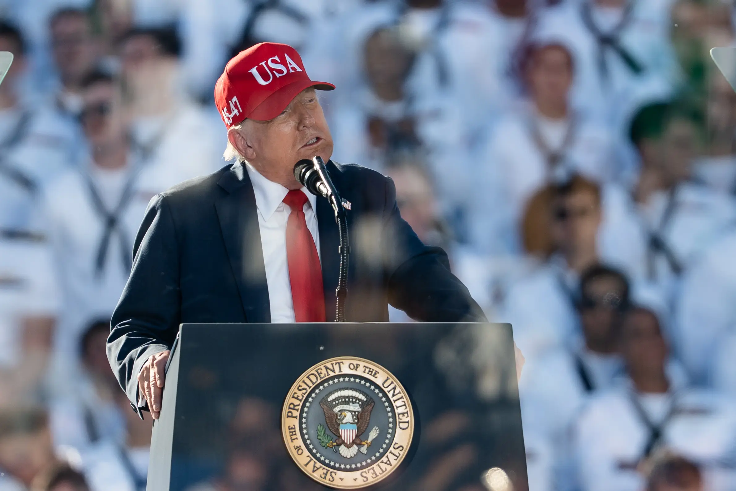 2025年10月6日,美国总统川普(特朗普)祝贺日本鹰派保守人士高市早苗(Sanae Takaichi)在自民党(LDP)总裁选举中胜选,即将成为该国历史上首位女首相。图为10月5日,川普在出席美国海军250周年庆祝活动期间,在杜鲁门号航空母舰上讲话。(Madalina Kilroy/大.纪.元;)