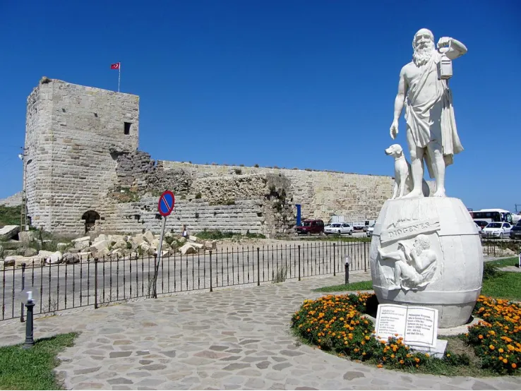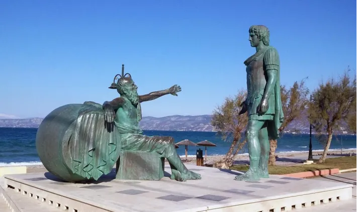 根据多种文本塑造的第欧根尼形象也很多,通常是个衣不蔽体或破衣褴褛的中老年人,除了油灯之外,有时还拄着一根棍子或跟着一只狗。图6是他家乡锡诺普建立的一座雕像,这个黑海之滨的城市如今是一个旅游圣地,第欧根尼则是它的一个重要名片。