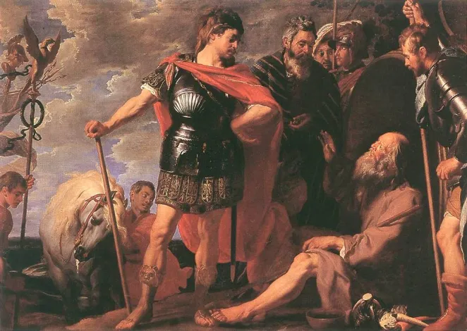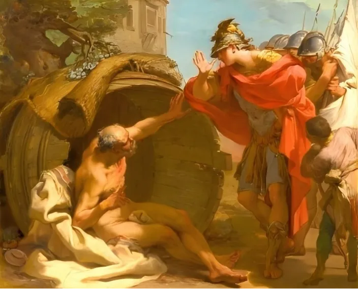 有几个关于第欧根尼与亚历山大大帝的故事广为流传,其中影响最大的一则出自罗马作家普鲁塔克(Plutarch,46-120)的《希腊罗马英豪列传》,后来成了许多艺术家创作的素材。话说亚历山大征服了希腊本土各城邦之后,在科林斯举行的地峡运动会上被推为统帅,决定向希腊世界的宿敌波斯发起战争。各城邦的政要与哲人纷纷赶来拜访与祝贺,有点像我们春秋时代的诸侯会盟,在当时是一件惊天动地的大事。出乎预料的是,近在咫尺的第欧根尼却无动于衷。普鲁塔克写道: