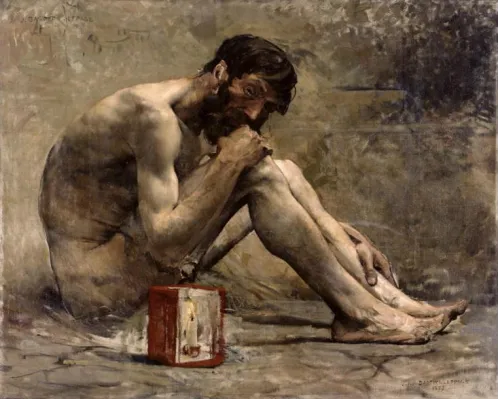 法国19世纪自然主义画风的巴斯蒂安-勒帕吉(Jules Bastien-Lepage,1848—1884)笔下的第欧根尼一丝不挂,画面中唯一的道具是提灯。