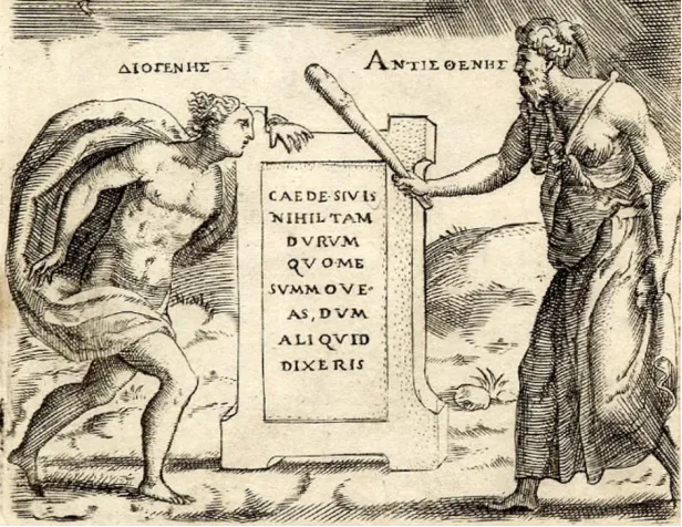 犬儒学派最有影响的人物是被拉斐尔画入《雅典学园》的第欧根尼,他生于黑海南岸的希腊殖民城市锡诺普(Sinope,今属土耳其),因参与了父亲造币引起的风波而被逐出城邦,长期活跃于希腊本土的雅典与科林斯。其真实生平很难说清,但是古代文献中留有大量关于他的传闻轶事。据说他在雅典被安提斯泰尼的苦修学说深深吸引,上门请求指导,后者不予理睬并用棍子驱赶他。第欧根尼忍着击打,最终成了安提斯泰尼的门生。图3是16世纪意大利雕刻家与版画家博纳索内(Giulio Bonasone,1531—after1576)的一幅书籍插图,描绘了安提斯泰尼以奇特方式收徒的场景。画面中石碑上的拉丁文写着:“你想打死我就来吧。只要你说一句话,就能把我带走,这不是什么难事(Caede si vis. Nihil tam durum quo me summoveas, dum aliquid dixeris)。”