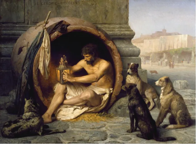 传说第欧根尼常年住在一个木桶(也有人说是装死人的泥瓮)里,全部的财产就是这只栖身的桶(或瓮)、一件烂斗篷、一盏油灯,还有一支棍子。19世纪法国学院派画家杰罗姆(Jean-Léon Gérôme,1824—1904)对此给出了生动的描绘:半裸的第欧根尼坐在铺着干草的泥瓮里,手里正在摆弄他那盏油灯,四只狗围在身边,还有一只在其背后的广场游荡,远方依稀可见集市和神庙。