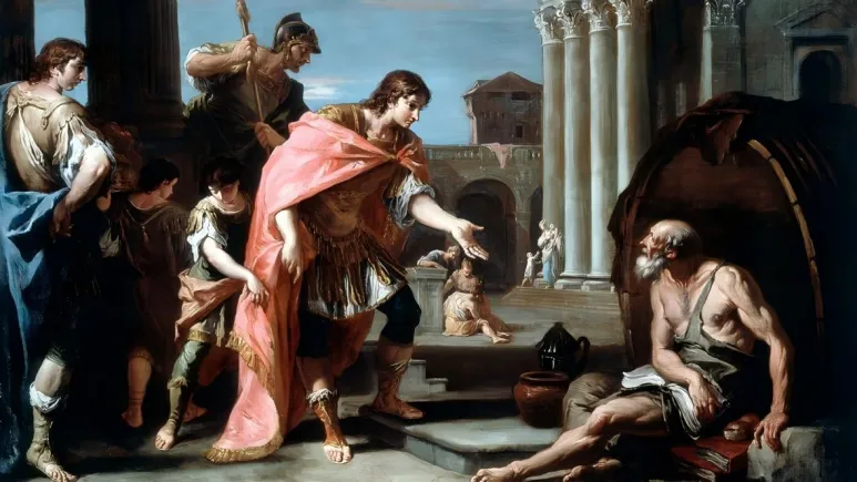 等到亚历山大前去拜访,发现他正躺着地上晒太阳。第欧根尼发现很多人走到身旁,稍微抬抬身子,用一种降尊纡贵的神色望着亚历山大,等到亚历山大很客气问他有什么地方可以效劳的时候,他说道:“很好,请你站开一点,不要挡住阳光。”有如赤子之心的回答使得亚历山大深深受到感动,这个对他不理不睬的人竟然具备视富贵如浮云的伟大气质,让他极为惊奇。他们离开之际,随行的人嘲笑哲学家的说话竟然一点都不懂人情世故,他却告诉他们,如果他不是亚历山大的话,也愿意做一个像第欧根尼那样的人物。