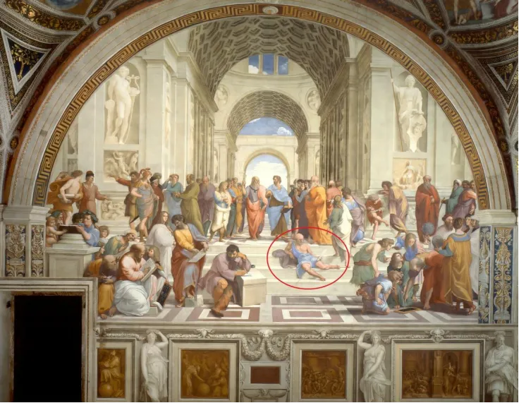 在拉斐尔的名画《雅典学园》中,以柏拉图和亚里士多德为中心分别排列着50多位人物,大致可以分成前后两群,而在中间,一个斜倚在台阶上的人旁若无人地阅读,茕茕孑立,孤影相吊,显得格外突出,他就是犬儒学派的代表第欧根尼(Diogenes,约前412-323)。