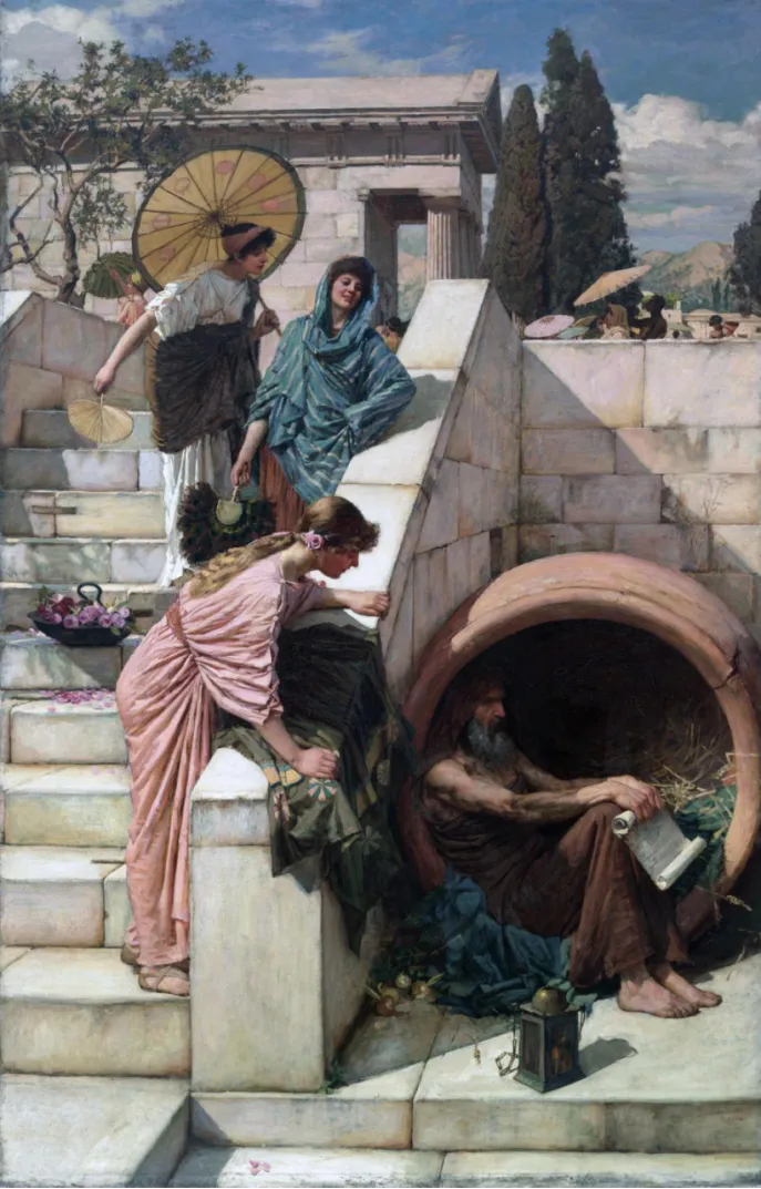 第欧根尼名声大噪,一定程度上与他的怪异举止有关,毕竟吃瓜群众比学究要多得多,古今中外概莫例外。最后让我们来欣赏英国唯美主义画师沃特豪斯(John William Waterhouse,1849-1917)的画:听说科林斯来了一位有学问的怪人,喜欢猎奇的贵妇小姐们纷至沓来,想要看一眼这位不食人间烟火的哲人到底是个什么模样,或许还要逗引他开口,以便作为家庭晚餐或社交场合的谈资。