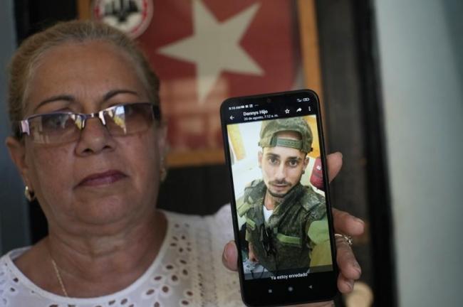家住古巴哈瓦那的妇女维奈特手持手机照片,影中人是穿着迷彩军装的儿子。她说儿子本是被聘去俄罗斯做建筑工程,但没想到被送到乌克兰战场打仗。(美联社)