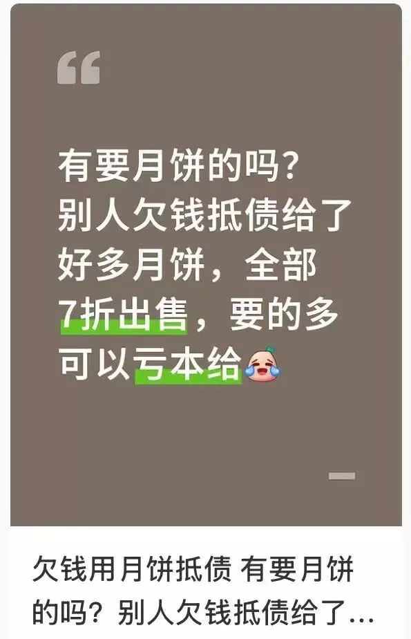 消费者也很为难,不堪其扰。我微信里3600人,上个礼拜开始频繁收到各种群发推送的中秋节月饼礼盒——市里最出名的本地老菜馆,正发匠心手作的传统老式月饼,138元6个;我常买甜品的小区蛋糕店,也说我成了VIP顾客要送月饼体验券,买月饼有优惠;我在郑州遇到的KTV公关,他也兼职卖开了月饼,还是浪漫的稻花村红酒月饼礼盒;我大学时千方百计要到的摇滚乐队帅主唱微信,群发消息问我要不要买邮政月饼,令我瞬间祛魅。
