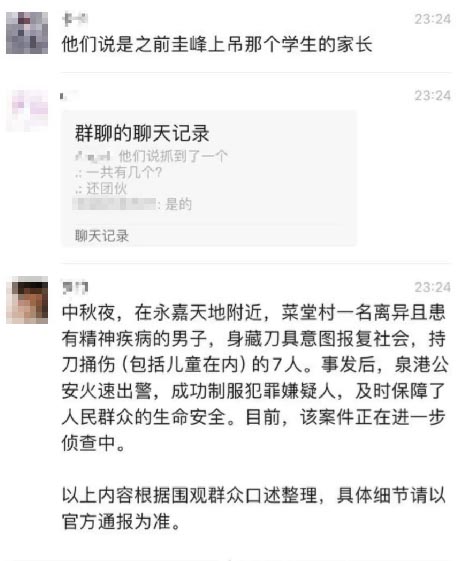 网上有官方通报口吻的帖文称,当晚22时左右,“菜堂村一名离异且患有精神疾病的男子”持刀伤人,7人被捅伤。凶犯“已经被抓”云云。