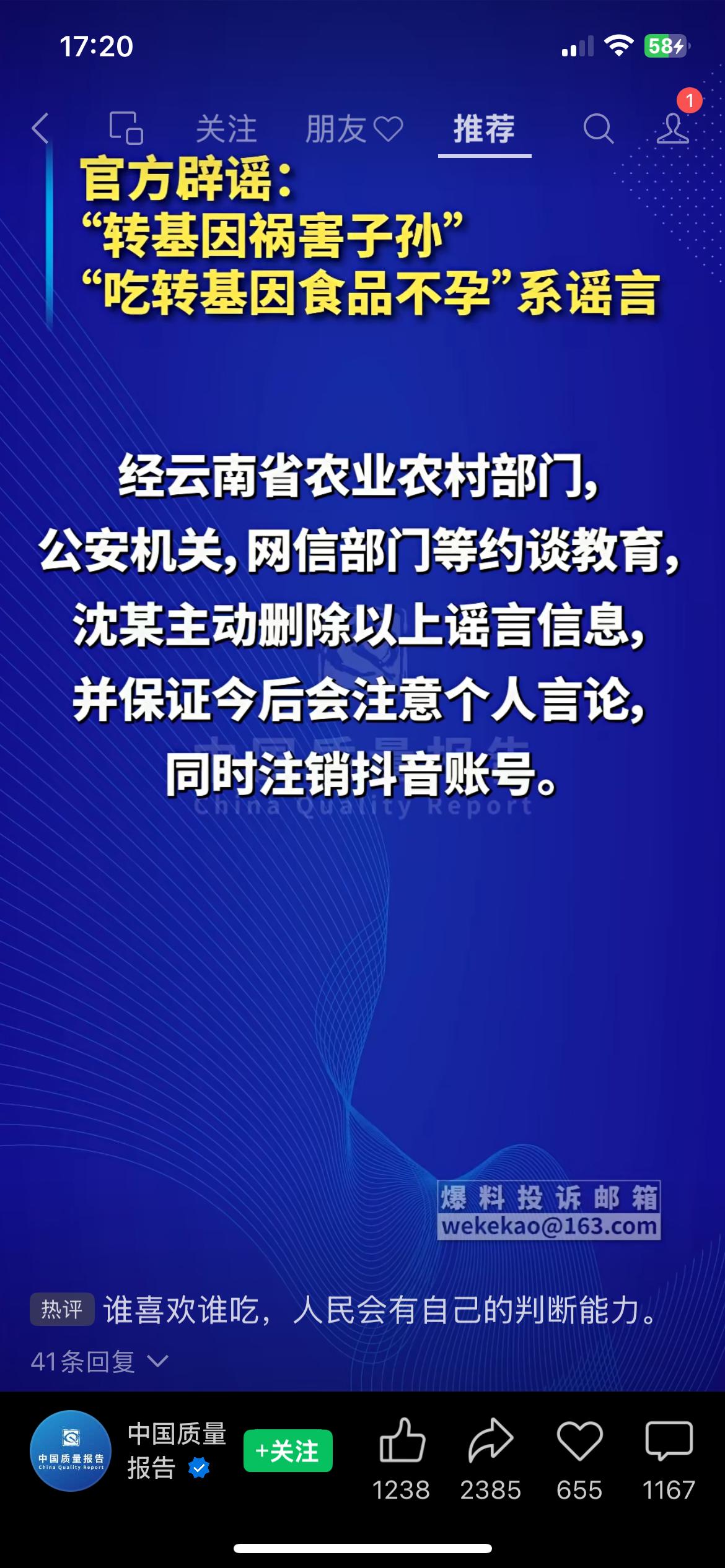 10月1日,大陆媒体中国质量报(中国质量报告客户端)发布推送,对“转基因祸害子孙”“吃转基因食品不孕”等网络说法,认定为谣言。