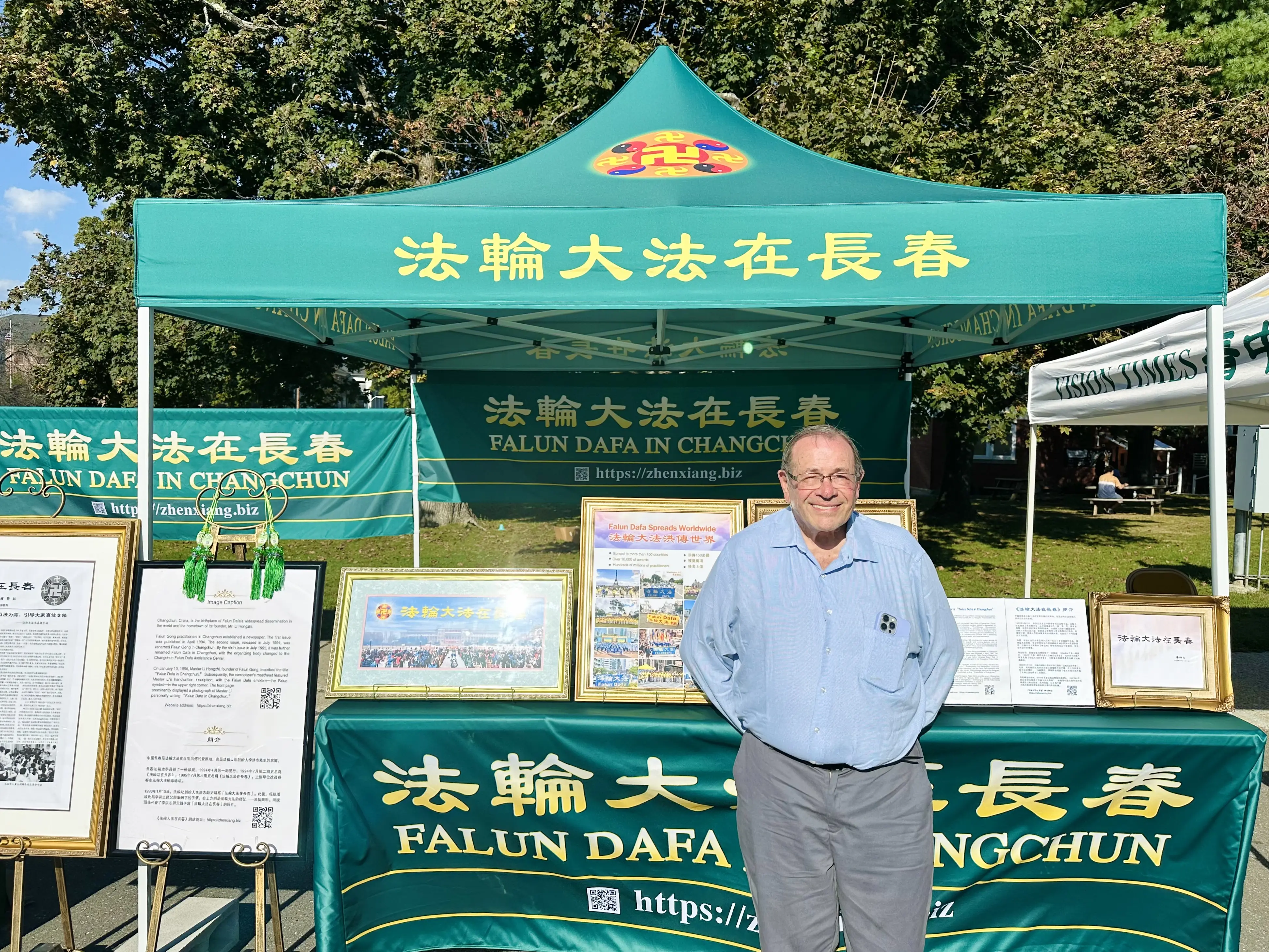 9月27日,巴拉夫参加了在纽约上州橙县中城举行的2025“艺术文化节”(Arts& Culture Festival2025),他站在“法轮大法在长春”的展位前与法轮功学员Yilian Zhao攀谈。在展位上,法轮功学员展示了法轮大法创始人李洪志先生1992年5月13日在他的家乡——中国长春向世间传出法轮大法。法轮大法是佛家上乘修炼大法,以“真、善、忍”为根本指导修炼,如今已传播到世界100多个国家和地区;法轮功的主要著作《转法轮》已被翻译为50种不同的语言。