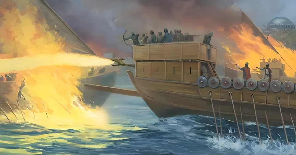 这年的6月25日,阿拉伯军队终于对君士坦丁堡发起总攻,由于该城三面环海,因此海战是这场战争中最重要的一环。当阿拉伯海军驾驶舰船攻向君士坦丁堡时,他们发现拜占庭人并不热衷反攻,反而冷静地将一种不知名的液体喷向他们,这些液体像油脂一样浮在水面上,拜占庭军队用点燃的弓箭射向他们,顿时,火光四起,烈焰熊熊。