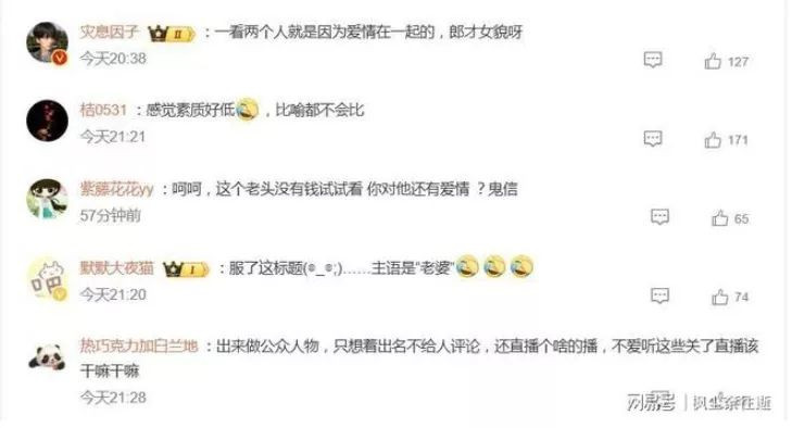 这种反差,也让网友阵营迅速分化。一部分人认为婚姻的本质本就是多元的,有人讽刺道:“呵呵,这个老头没有钱试试看?你对他还有爱情?鬼信。”直指31岁的年龄差(张纪中甚至比岳母还大10岁)让爱情显得苍白,更多是资源交换的现实结合。而另一部分人则坚持“成年人的结合本就不只有爱一种答案”,甚至有支持者调侃:“一看两个人就是因为爱情在一起的,郎才女貌呀。”