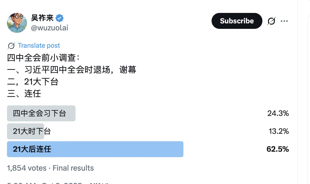 10月2日,吴祚来在推特上做了个四中全会前的小调查,包括:一、习*近*平四中全会时退场,谢幕;二、21大下台;三、连任。截止10月6日总共有1854人参与,结果显示,62.5%的网友认为,习*近*平会在21大之后继续连任,只有24.3%认为习会在四中全会下台,还有13.2%认为他会在21大时下台。