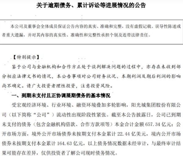 根据阳光城公告,截至今年9月25日,阳光城已到期未支付的债务(包含金融机构借款、合作方款项等)本金合计金额高达657.34亿元。