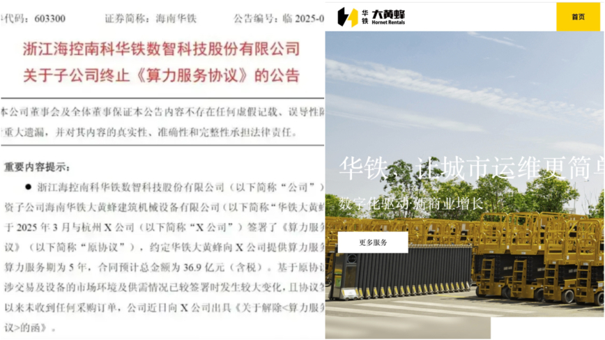 据大陆媒体证券时报报导,9月30日晚间,海南华铁发布公告称,其全资子公司海南华铁大黄蜂建筑机械设备有限公司(简称“华铁大黄蜂”)与杭州X公司(简称“X公司”)签署的《算力服务协议》终止。