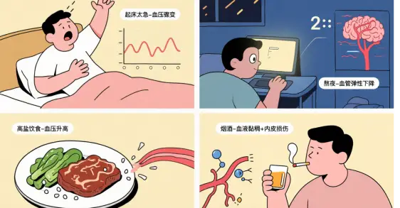 日常很多不经意的习惯,都在悄悄伤害脑血管。比如有些人早上起床太急,猛地坐起来或站起来,会让血压突然波动,脑血管暂时供血不足,容易眼前发黑;还有人喜欢熬夜,凌晨才睡觉,熬夜会让脑血管一直处于紧张状态,得不到休息,慢慢失去弹性,供血能力下降;另外,有些人饮食不规律,顿顿吃高盐食物,比如腌咸菜、酱肉,过多的盐分会让血压升高,长期“冲击”脑血管,容易导致血管淤堵;甚至有人吸烟喝酒很频繁,尼古丁和酒精会直接损伤脑血管内皮,让血液黏稠度升高,增加脑血管淤堵的风险,眼前发黑的情况会越来越频繁。