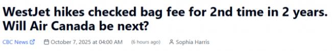 这是该航空公司在不到两年内第二次涨价。而根据过去的经验,加航(Air Canada)可能很快也会跟进。