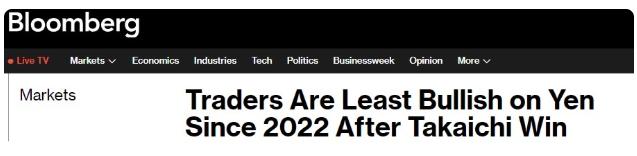 彭博社10月7日报道,由于支持刺激计划的议员高市早苗(Sanae Takaichi)几乎肯定会当选下一任日本首相,导致日元暴跌,期权交易员对日元的看涨情绪达到三年多以来最低。