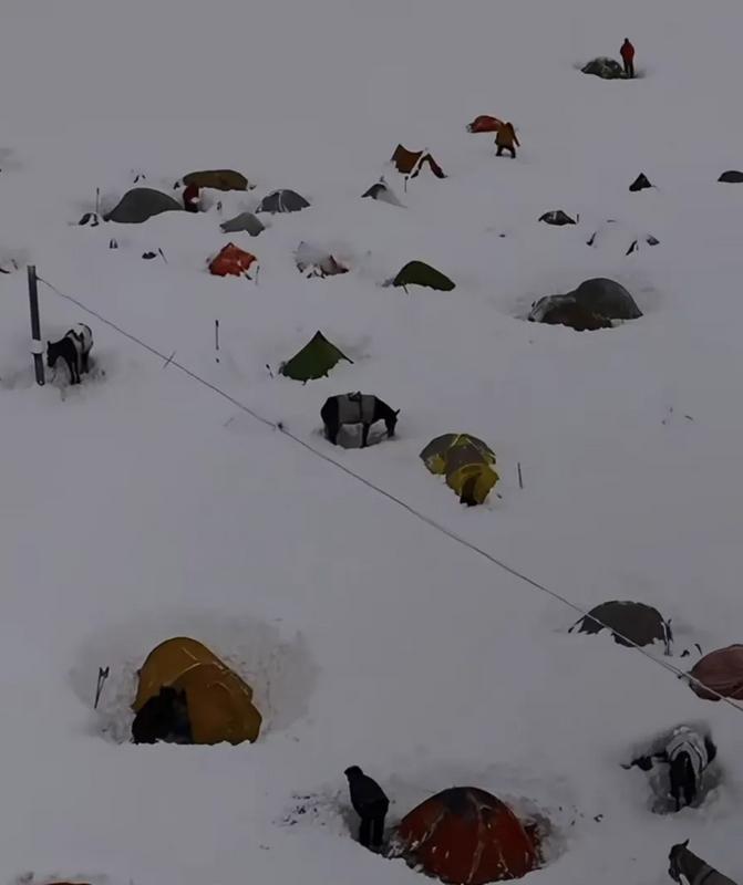 从当事人的社群贴文可以看出,此次圣母峰东坡遭遇的暴风雪强度罕见,降雪量已达近年同期极值。影片中可以看到现场极厚的积雪,甚至令牦牛都难以行动。一位亲历者回忆:帐篷被暴雪掩埋的那一刻,才真正体会到人类在大自然面前的渺小。整整两天,天地间只剩白茫茫一片,唯有刺骨的风声与压抑的寂静。