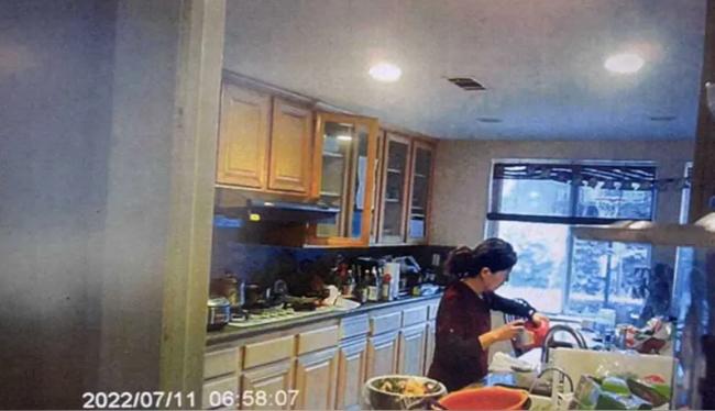 检方提交的视频证据,显示余月往杯中倒强力清洁剂“通乐”。(取自法庭文件)