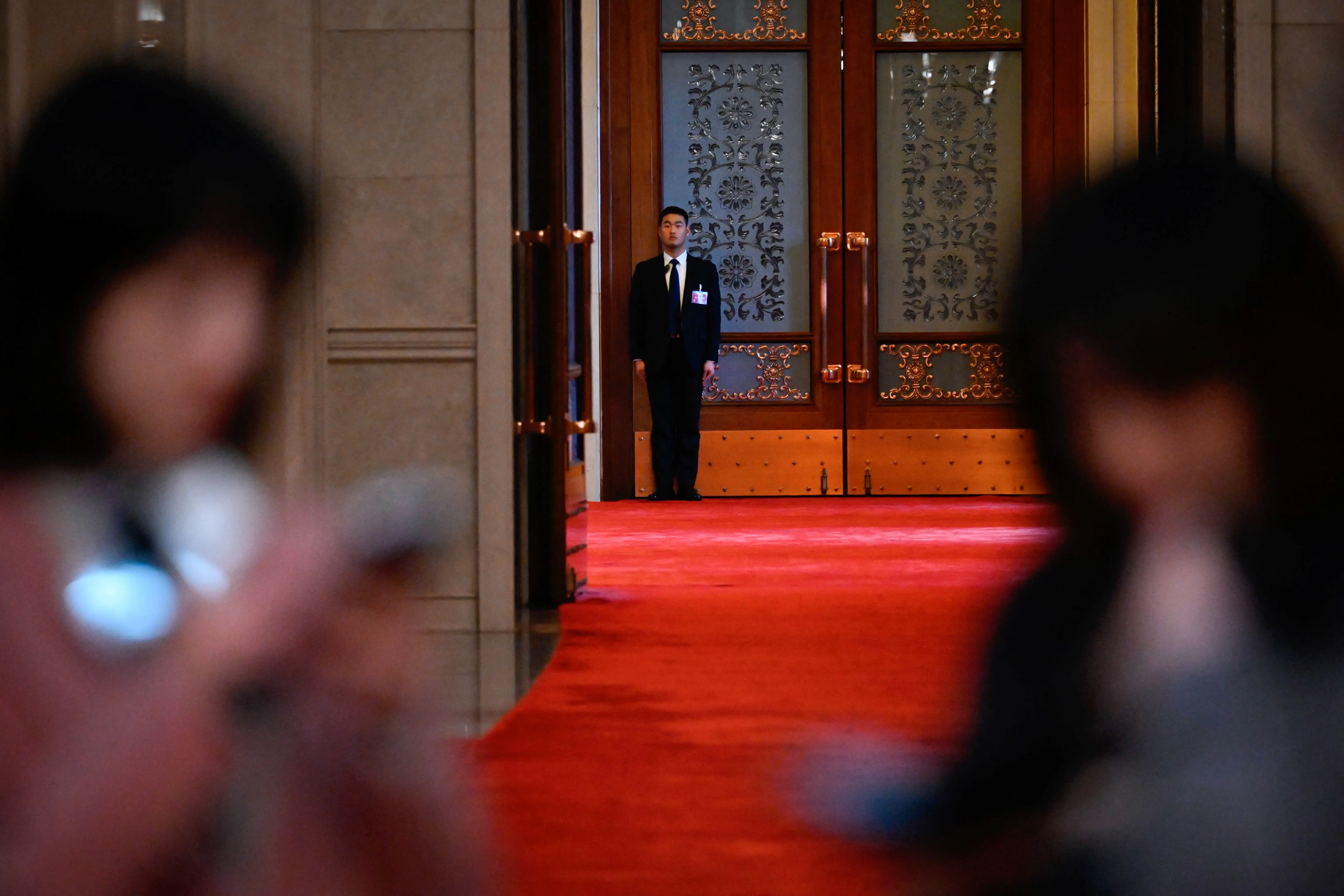2025年3月7日中共两会期间,一名保安站在会场外。(Wang Zhao/AFP via Getty Images)