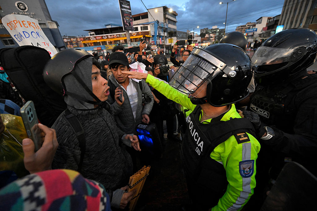 2025年9月30日,厄瓜多尔国家原住民联合会(CONAIE)发起全国性罢工抗议活动,与防暴警察发生冲突。(RODRIGO BUENDIA/AFP via Getty Images)