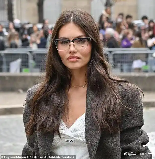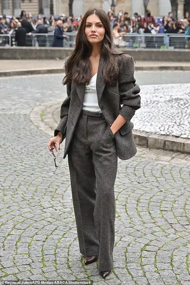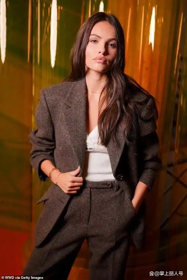 法国模特蒂兰·布隆多(Thylane Blondeau),于当地时间10月6日,在巴黎时装周Miu Miu秀场上亮相,身着棕色羊毛西装,搭配白色V领毛衣和棕色高跟靴,展现出优雅的成熟女性魅力。