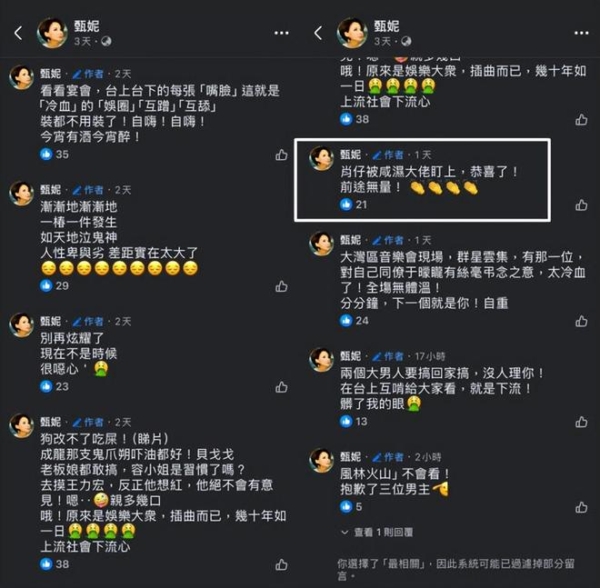 甄妮再为于朦胧发声,疑遭到威胁“闭嘴”。(脸书截图/微博图)