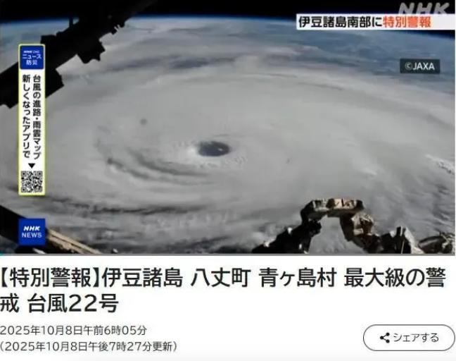 据日本气象厅消息,伊豆群岛可能出现因强风导致建筑物倒塌、因巨浪引发大范围浸水等数十年一遇的严重灾害,此外还可能发生山体滑坡、低洼地区浸水及河流泛滥等次生灾害,呼吁当地民众密切关注避难信息,并前往安全场所避险。