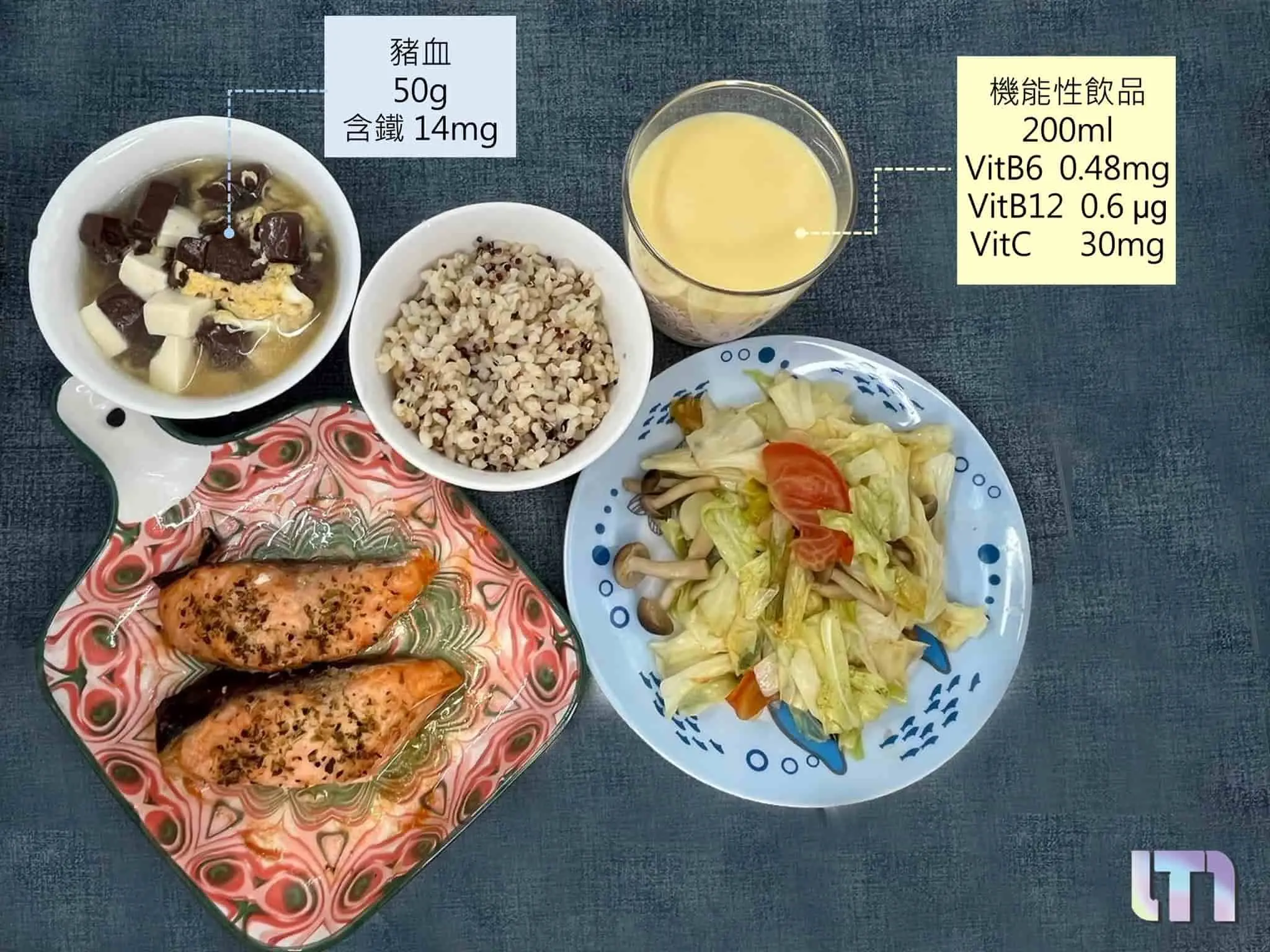 补铁晚餐菜单:烤鲑鱼、黑白豆腐羹、花椰菜糙米饭、番茄炒高丽菜